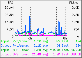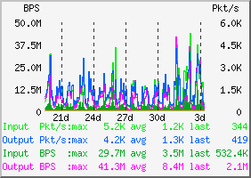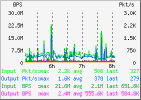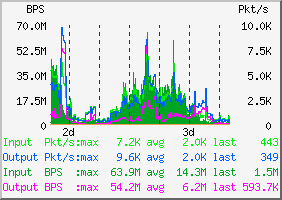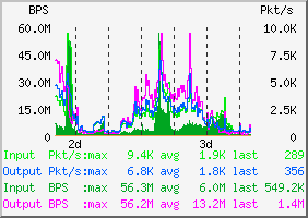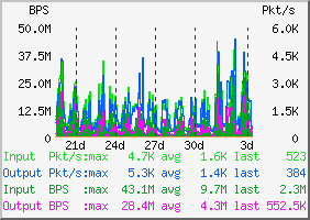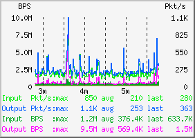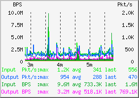 3分钟的图中,每个点分别表示1秒钟的间隔内收、发数据包的个数以及比特。 3小时的图中,每个点分别表示1分钟的间隔内,每秒钟平均收、发数据包的个数以及比特。 1.5天的图中,每个点分别表示12分钟的间隔内,每秒钟平均收、发数据包的个数以及比特。 15天的图中,每个点分别表示2小时的间隔内,每秒钟平均收、发数据包的个数以及比特。